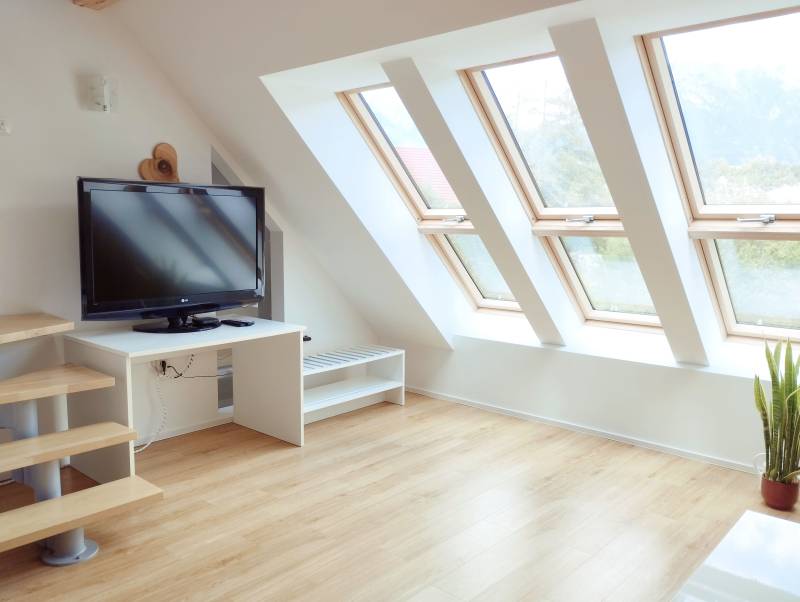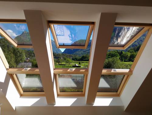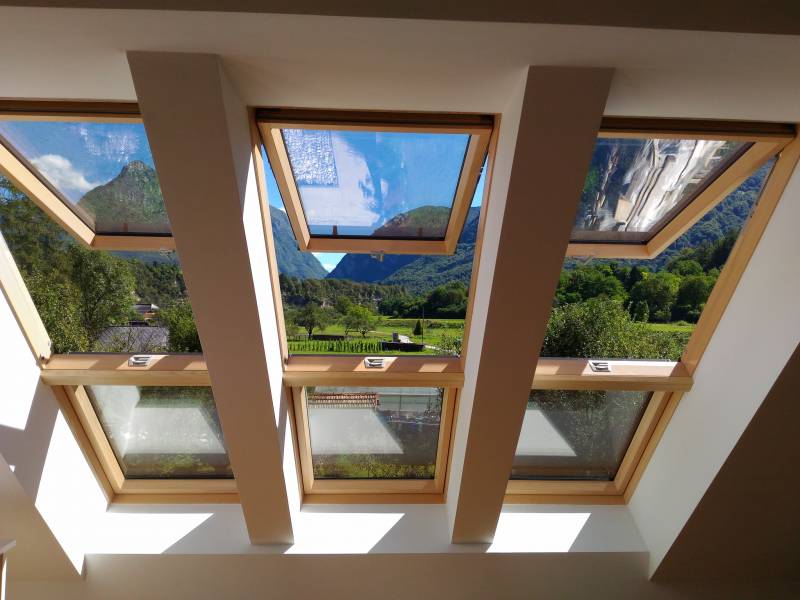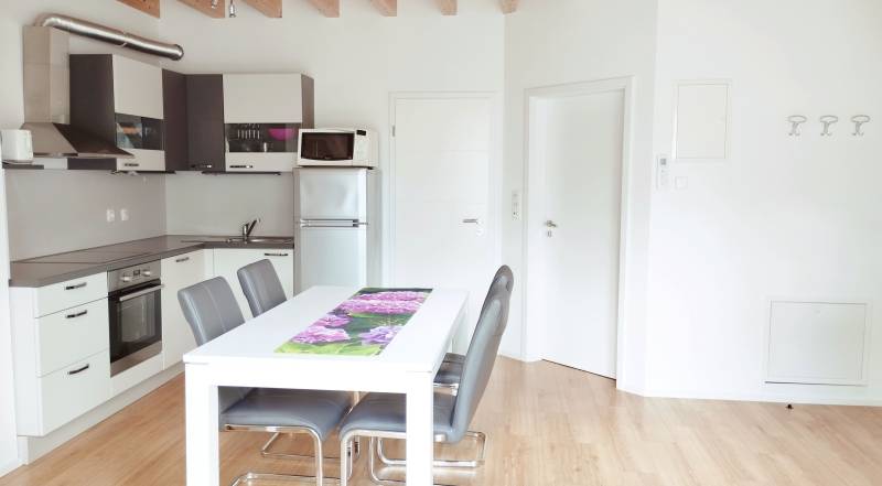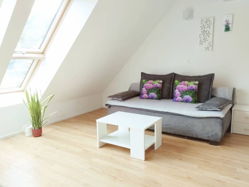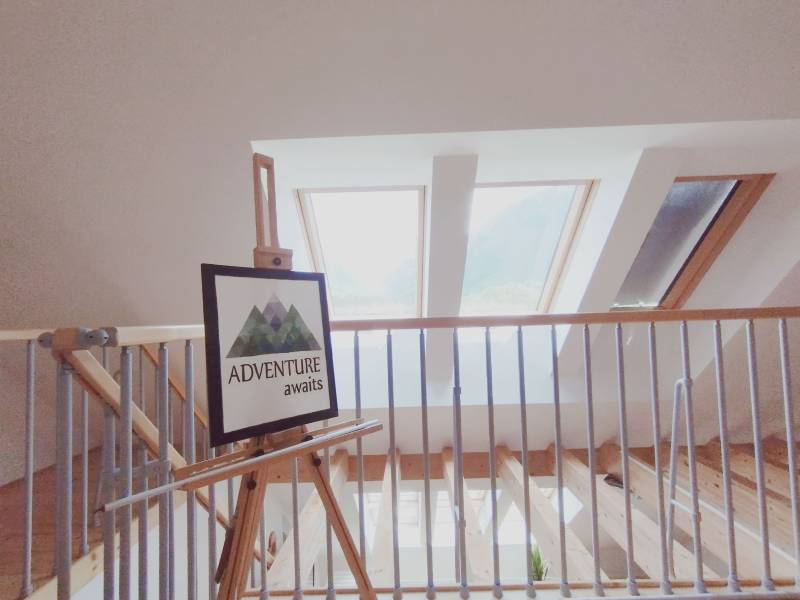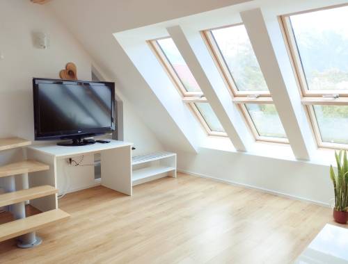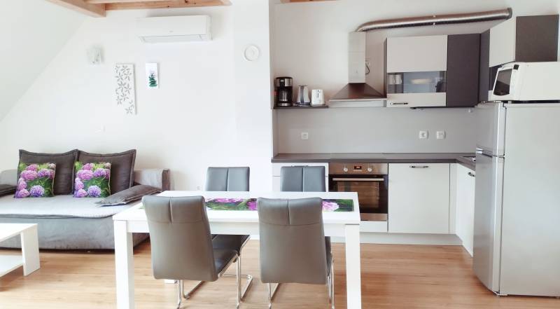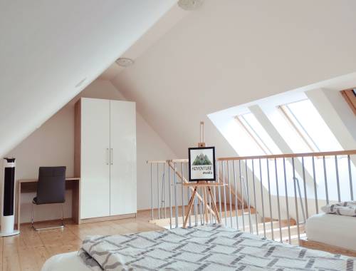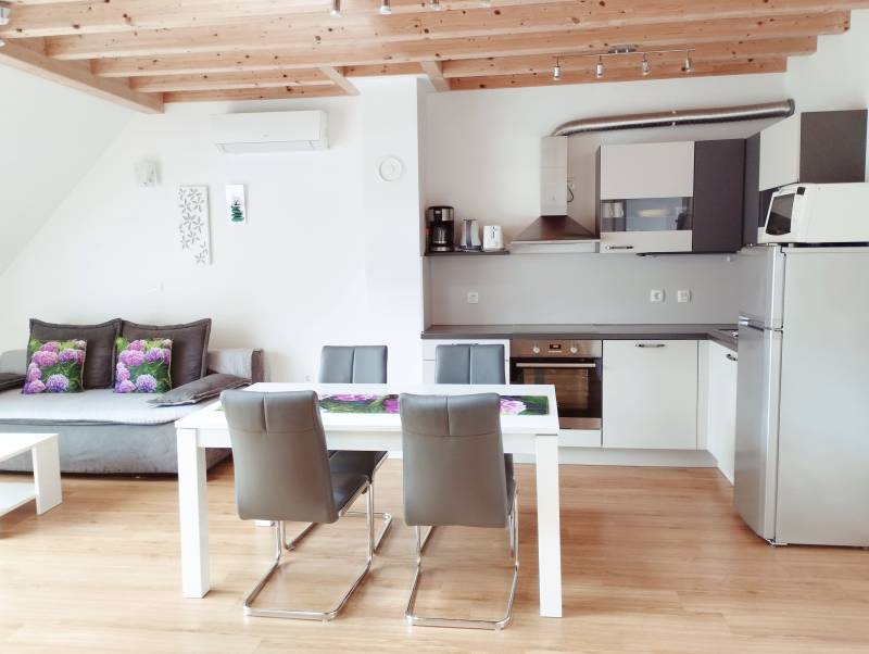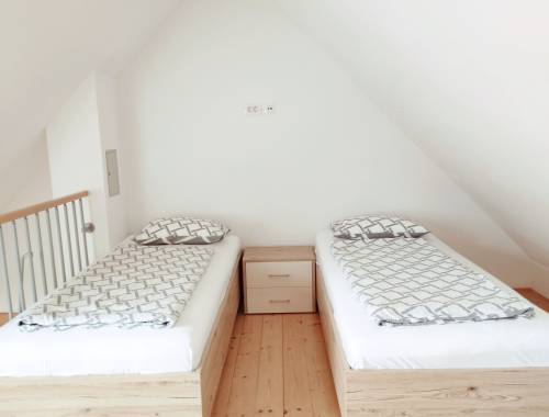 Spacious rooftop apartment with 2 bedrooms, living room, private bathroom and a well equipped kitchen. The interior is very bright with modern furnishing and a wonderful view of the Julian Alps as well as the magical landscape of Triglav National Park. In the apartment you will find one bedroom with a king size double bed (180 x 200 cm) and the second bedroom, in the gallery, with two single beds (two times 90 x 200 cm). Upon request the two single beds can be joined together into a double bed. Up to 2 additional guests can sleep in the living room on a comfy sofa (160x200 cm).